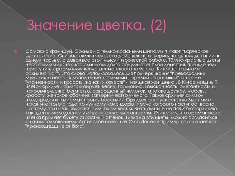 Они заставляют человека действовать и творить на одном дыхании, в одном порыве, отдавая все свои мысли творческой работе. Тёмно-красные цветы необходимы для тех, кто слишком долго обдумывает план действия, прежде чем приступить к реальному воплощению своего замысла. Китайцы называли орхидею "Lan". Это слово использовалось для подчеркивания "превосходных мужских качеств", в дополнение к "сильный", "зрелый", "красивый", а так же "утонченности и красоты женских качеств" - "изящная женщина". В Китае изящный цветок орхидеи символизирует: весну, гармонию, изысканность, элегантность и покровительство, богатство, совершенный человек, а также дружбу, любовь, красоту, женское обаяние, затворничество ученого. Также орхидея символ плодородия и талисман против бессилия. Орхидея распускается во Вьетнаме накануне Нового года по лунному календарю, после которого наступает весна. Поэтому эти цветы являются символом весны. Вьетнамцы еще почитают орхидею как цветок молодости и любви, а также элегантности. Считается, что аромат этого цветка придает букету страстный оттенок. Глядя на эти цветы, можно согласиться с таким толкованием. Латинское название Orchidaceae примерно означает как "произошедшие от бога".