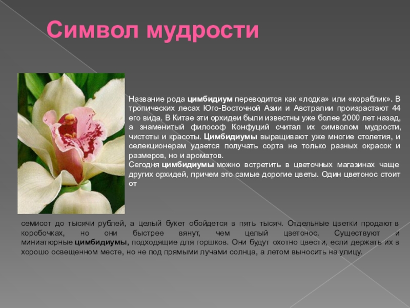 Орхидея - красавица, совершенство, великолепие и роскошь, утонченная красота, любовь, нежность, интимность; "Ты прекрасна (прекрасен)!" Орхидею принято дарить только любимым людям. И если вы хотите удивить своего любимого человека, композиции из цветов орхидей - это как раз, то, что вам нужно! Как в давности, так и сегодня, орхидея является символом утонченности, мудрости, аристократизма. Орхидея нередко символизирует любовь, красоту и гармонию, а также семейный уют. Белая орхидея символизирует чистую любовь, пестрая - страстное желание. Розовый цвет изысканных лепестков орхидеи означает чистую привязанность. Орхидея в букете - это символ любви, утонченности и … многодетности. Орхидеи считаются символом мужчины, превосходящего всех остальных. Такой подарок - выбор натур несколько холодноватых, рациональных, стремящихся во всем достичь идеала.