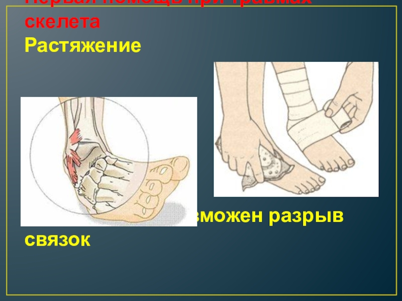 Слайд 9Первая помощь при травмах скелета Растяжение Последствия: возможен разрыв связок