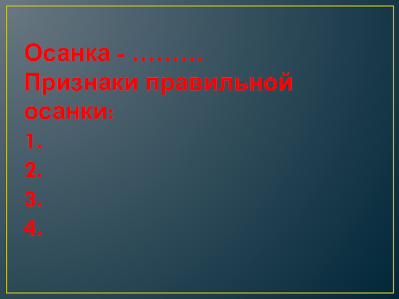 Слайд 4Осанка - ……… Признаки правильной осанки: 1. 2. 3. 4.