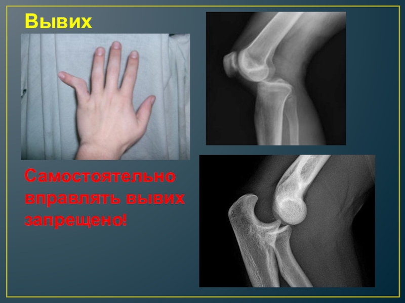 Слайд 10Вывих Самостоятельно вправлять вывих запрещено!