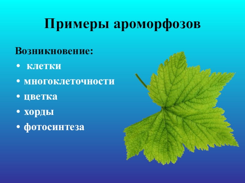 Примеры ароморфозовВозникновение: клеткимногоклеточностицветкахордыфотосинтеза