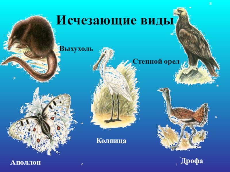 Исчезающие видыВыхухоль Аполлон Колпица Дрофа Степной орел