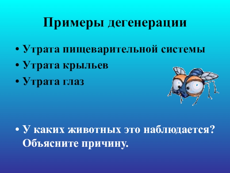 Примеры дегенерацииУтрата пищеварительной системыУтрата крыльевУтрата глазУ каких животных это наблюдается? Объясните причину.