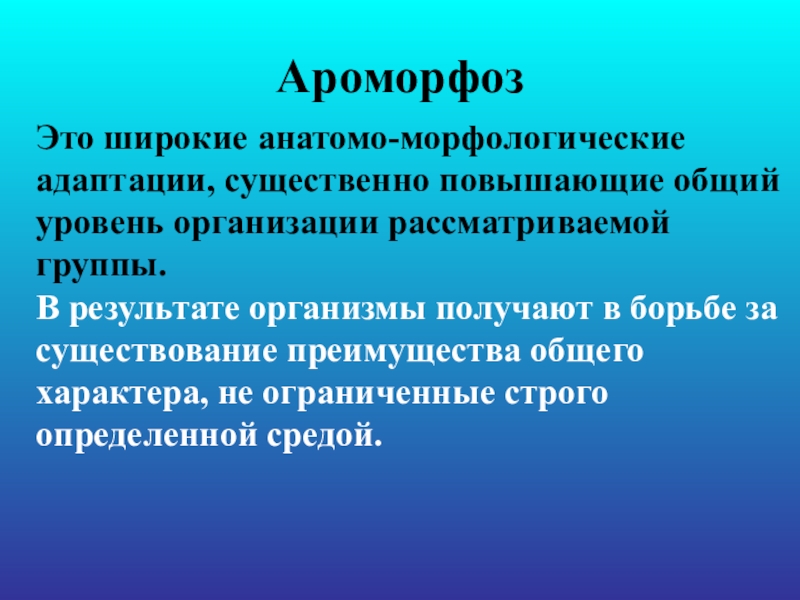Ароморфоз Это широкие анатомо-морфологические адаптации, существенно повышающие общий уровень организации рассматриваемой группы. В результате организмы получают в