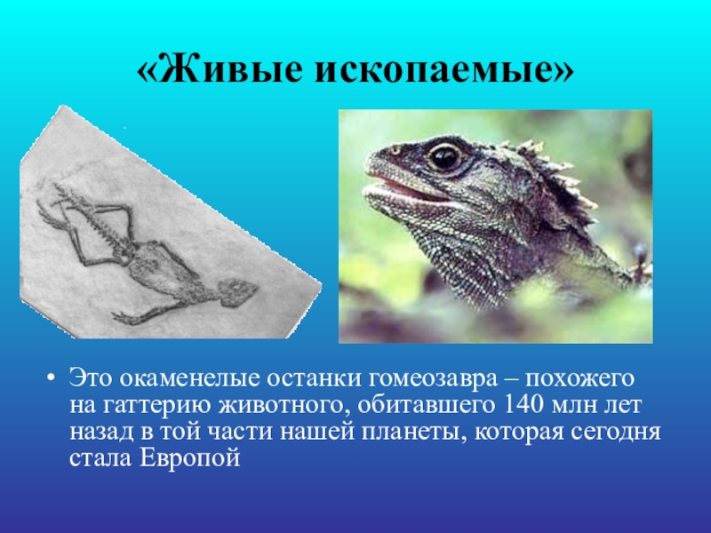 «Живые ископаемые»Это окаменелые останки гомеозавра – похожего на гаттерию животного, обитавшего 140 млн лет назад в той