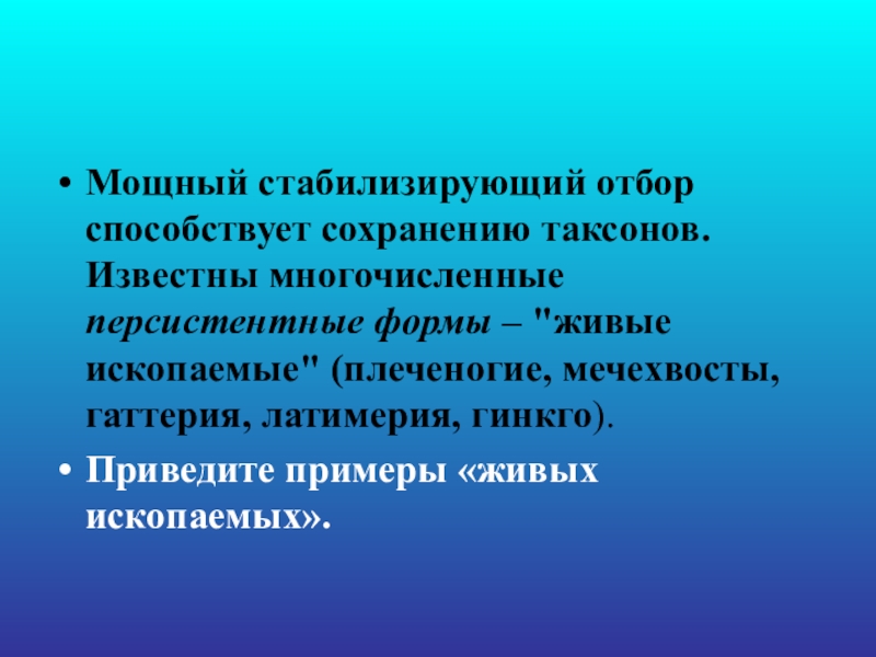 Слайд 10Мощный стабилизирующий отбор способствует сохранению таксонов. Известны многочисленные персистентные формы –