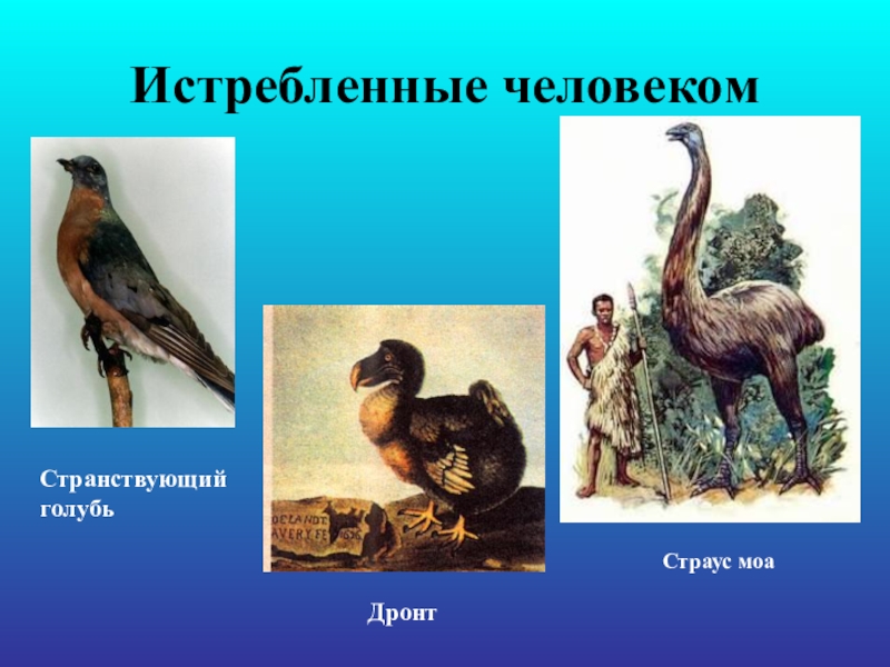 Истребленные человекомСтранствующийголубьДронт Страус моа