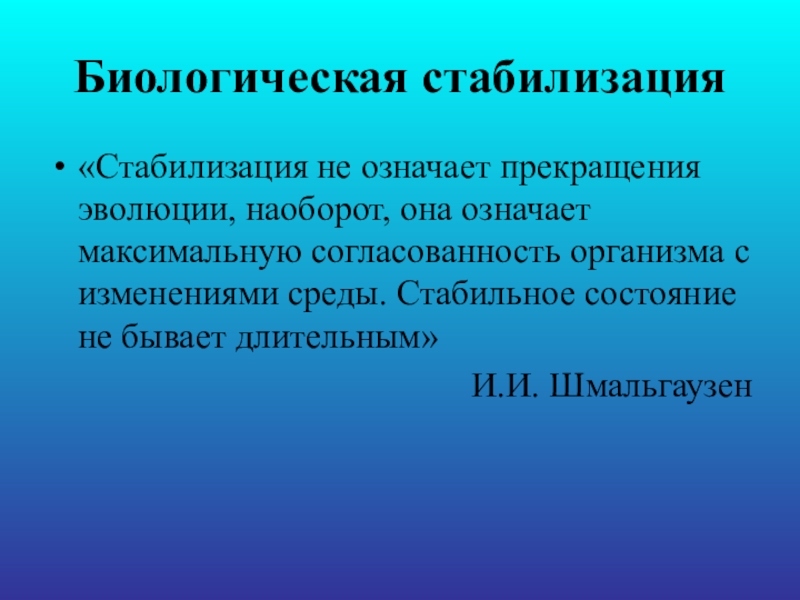 Биологическая стабилизация«Стабилизация не означает прекращения эволюции, наоборот, она означает максимальную согласованность организма с изменениями среды. Стабильное состояние