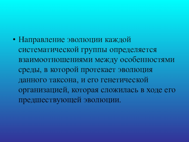 Направление эволюции каждой систематической группы определяется взаимоотношениями между особенностями среды, в которой протекает эволюция данного таксона, и его генетической организацией, которая сложилась в ходе его предшествующей эволюции.