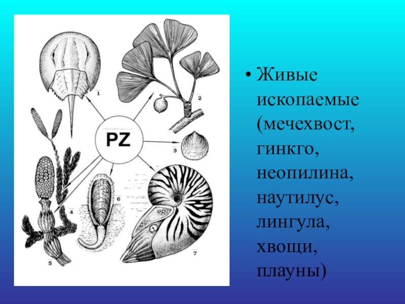 Слайд 14Живые ископаемые (мечехвост, гинкго, неопилина, наутилус, лингула, хвощи, плауны)