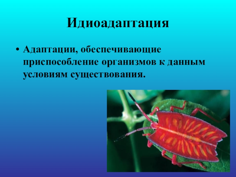 ИдиоадаптацияАдаптации, обеспечивающие приспособление организмов к данным условиям существования.