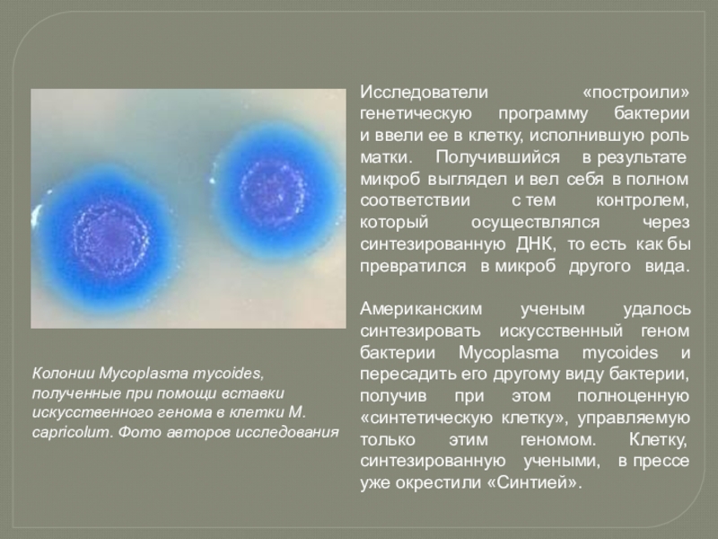 Американским ученым удалось синтезировать искусственный геном бактерии Mycoplasma mycoides и пересадить его другому виду бактерии, получив при этом полноценную «синтетическую клетку», управляемую только этим геномом. Клетку, синтезированную учеными, в прессе уже окрестили «Синтией».