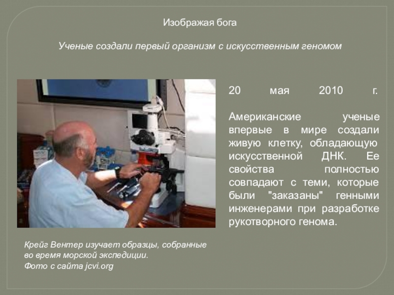 Исследователи «построили» генетическую программу бактерии и ввели ее в клетку, исполнившую роль матки. Получившийся в результате микроб выглядел и вел себя в полном соответствии с тем контролем, который осуществлялся через синтезированную ДНК, то есть как бы превратился в микроб другого вида.