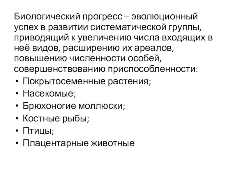 Биологический прогресс – эволюционный успех в развитии систематической группы, приводящий к увеличению числа входящих в неё видов, расширению их ареалов, повышению численности особей, совершенствованию приспособленности:Покрытосеменные растения;Насекомые;Брюхоногие моллюски;Костные рыбы;Птицы;Плацентарные животные