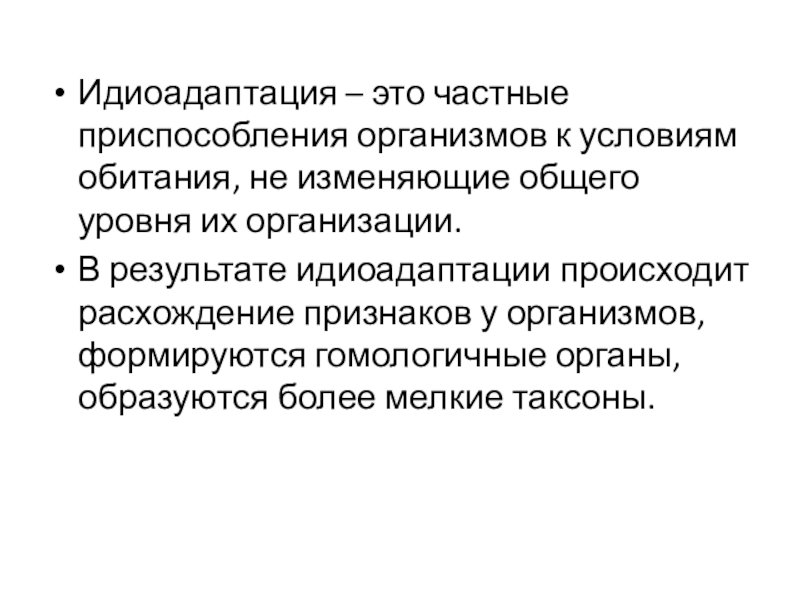 Слайд 9Идиоадаптация – это частные приспособления организмов к условиям обитания, не изменяющие