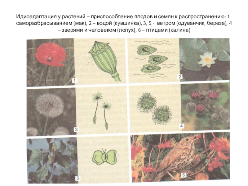 саморазбрасыванием (мак), 2 – водой (кувшинка), 3, 5 - ветром (одуванчик, береза), 4 – зверями и человеком (лопух), 6 – птицами (калина)