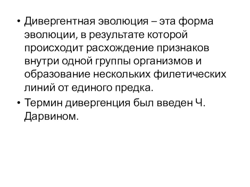 Слайд 22Дивергентная эволюция – эта форма эволюции, в результате которой происходит расхождение