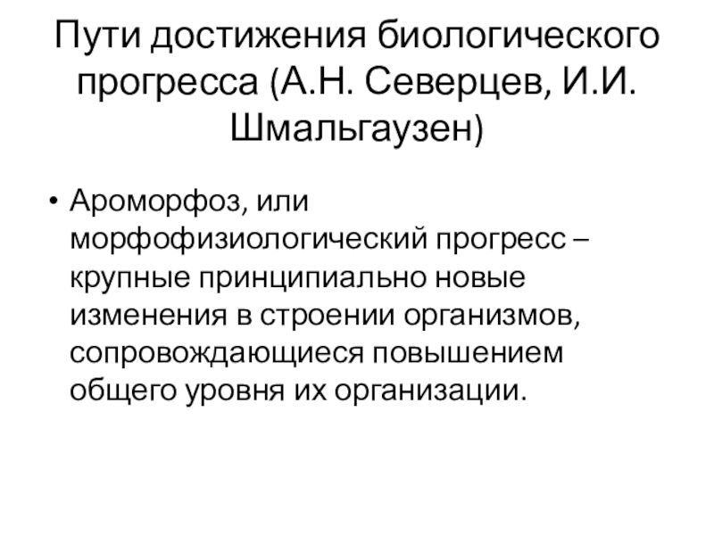 Пути достижения биологического прогресса (А.Н. Северцев, И.И. Шмальгаузен)Ароморфоз, или морфофизиологический прогресс – крупные принципиально новые изменения в