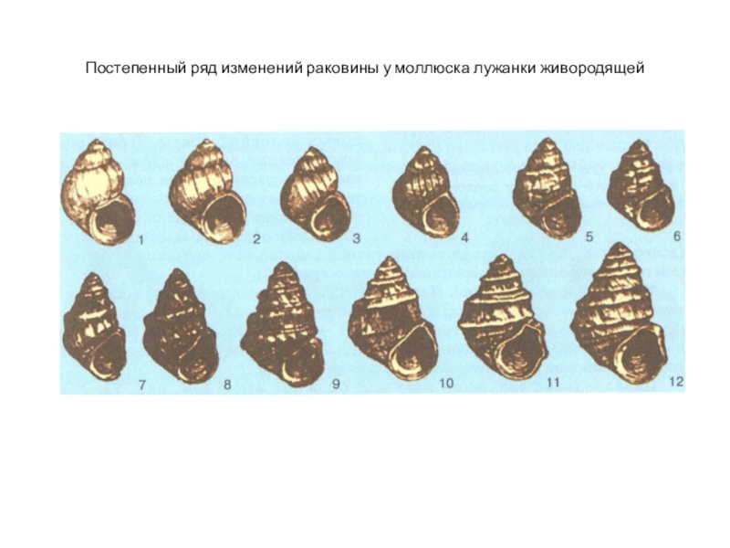 Слайд 20Постепенный ряд изменений раковины у моллюска лужанки живородящей