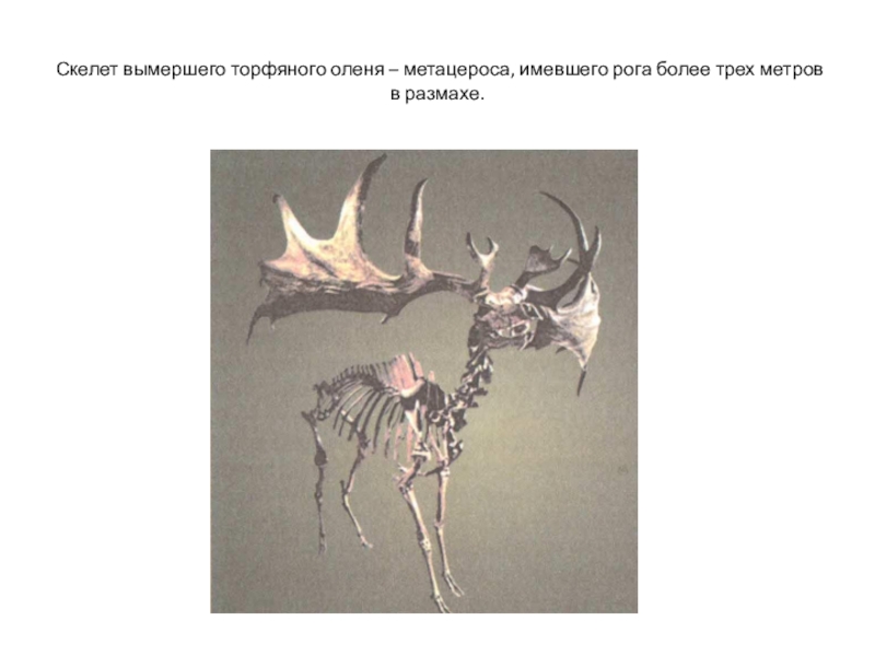 Слайд 5Скелет вымершего торфяного оленя – метацероса, имевшего рога более трех метров