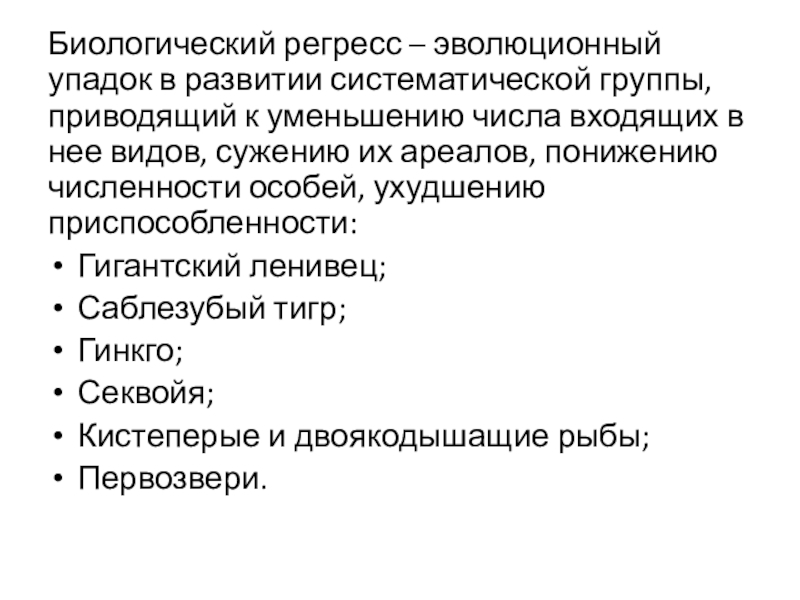 Слайд 4Биологический регресс – эволюционный упадок в развитии систематической группы, приводящий к