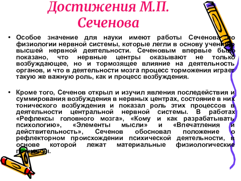 системы, которые легли в основу учения о высшей нервной деятельности. Сеченовым впервые было показано, что нервные центры оказывают не только возбуждающее, но и тормозящее влияние на деятельность органов, и что в деятельности мозга процесс торможения играет такую же важную роль, как и процесс возбуждения.