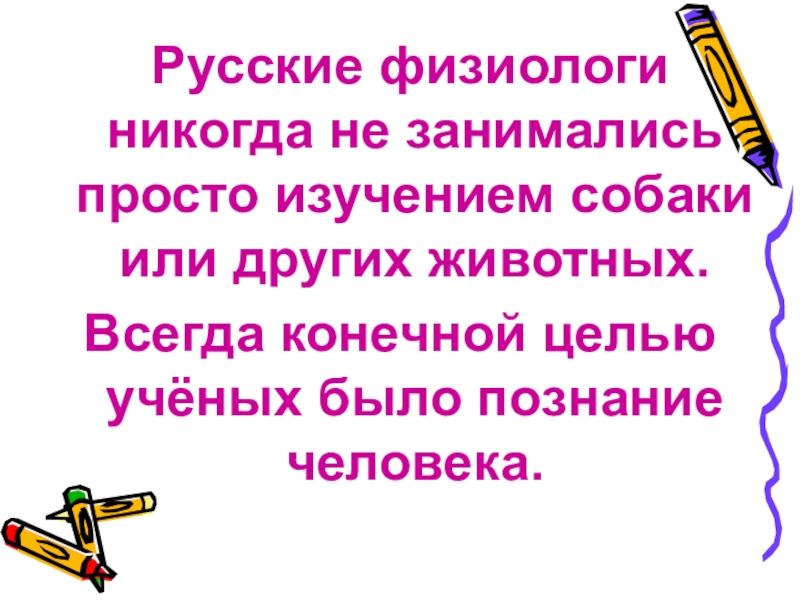 Слайд 10 Русские физиологи никогда не занимались просто изучением собаки или других