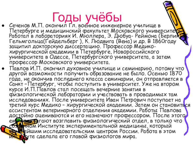 Павлов И.П. окончил духовное училище и семинарию, потому что другой возможности получить образование не было. Осенью 1870 года, не окончив последнего класса семинарии, он отправляется в Санкт –Петербург, чтобы поступить в университет. Уже на втором курсе И.П.Павлов стал посещать вечерние занятия в физиологической лаборатории и участвовать в проводимых там исследованиях. После университета Иван Петрович поступает на третий курс Медико – хирургической академии. Затем он становиться ассистентом ветеринарного отделения академии. Работы Павлова достойно оцениваются и его назначают профессором. После этого ему предлагают возглавить физиологический отдел, в только что созданном Институте экспериментальной медицины, который крупнейшим исследовательским центром России. Работа в этом институте сделала его главой физиологов мира.