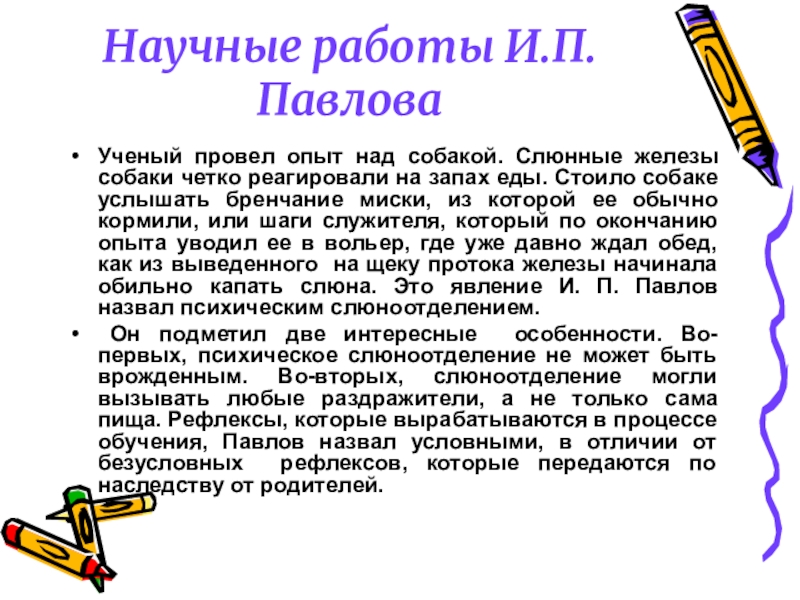 Он подметил две интересные особенности. Во-первых, психическое слюноотделение не может быть врожденным. Во-вторых, слюноотделение могли вызывать любые раздражители, а не только сама пища. Рефлексы, которые вырабатываются в процессе обучения, Павлов назвал условными, в отличии от безусловных рефлексов, которые передаются по наследству от родителей.