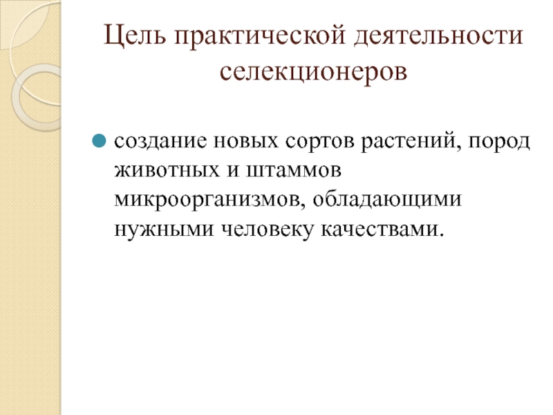 Цель практической деятельности селекционеровсоздание новых сортов растений, пород животных и штаммов микроорганизмов, обладающими нужными человеку качествами.