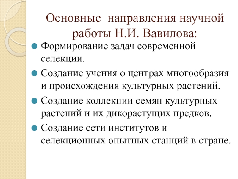 Основные направления научной работы Н.И. Вавилова: Формирование задач современной селекции.Создание учения о центрах многообразия и происхождения