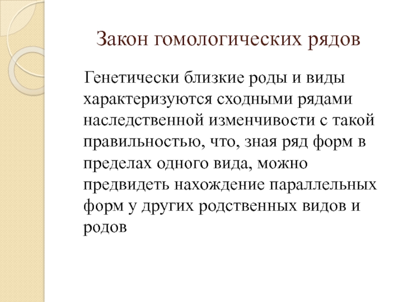 Закон гомологических рядов    Генетически близкие роды и виды характеризуются сходными рядами наследственной изменчивости