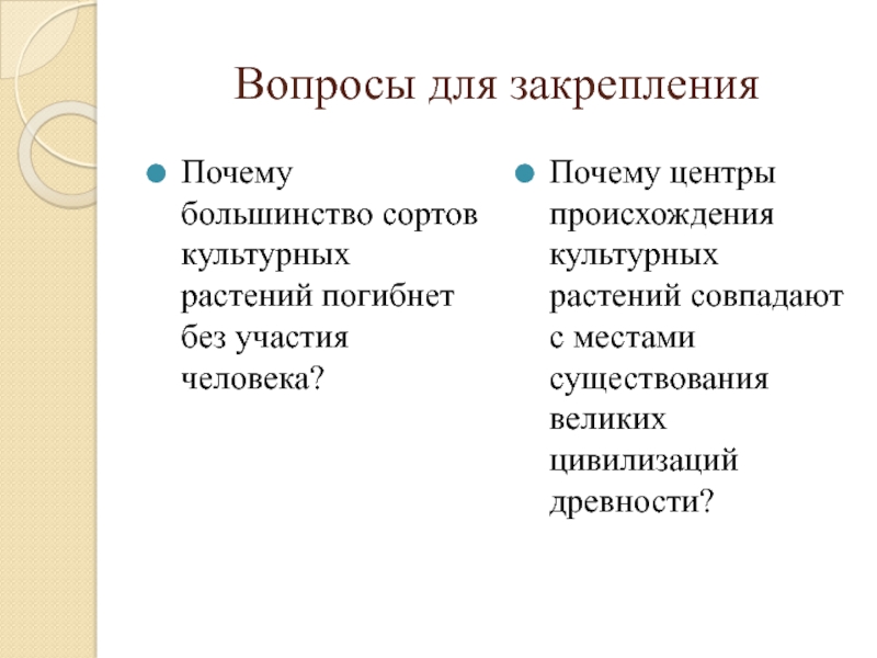 Вопросы для закрепленияПочему большинство сортов культурных растений погибнет без участия человека?Почему центры происхождения культурных растений совпадают с