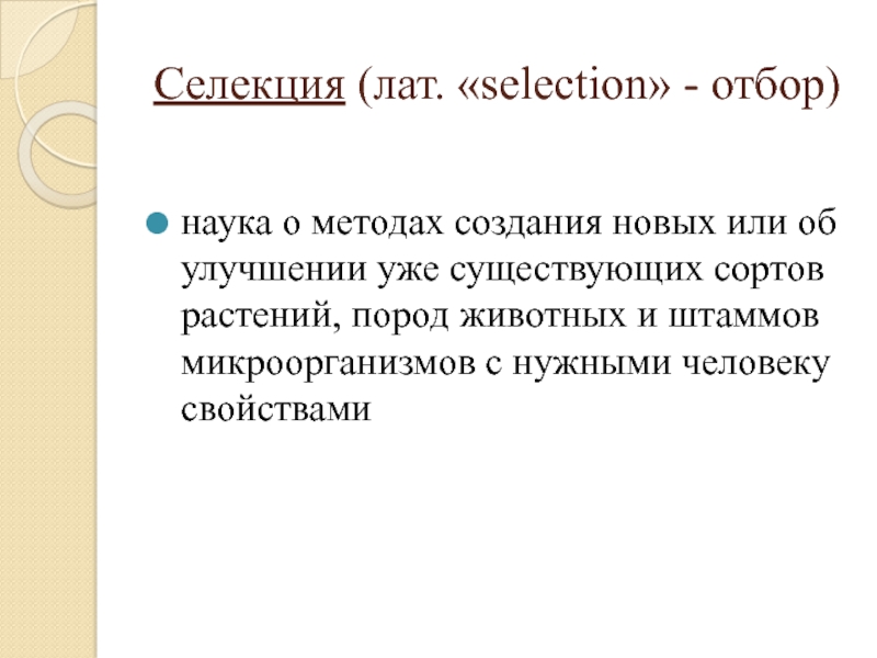 Селекция (лат. «selection» - отбор) наука о методах создания новых или об улучшении уже существующих сортов растений, пород животных и штаммов микроорганизмов с нужными человеку свойствами