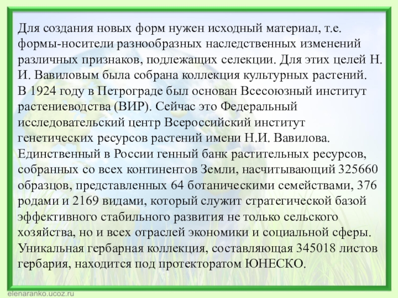 самым труднодоступным и зачастую опасным районам земного шара. К 1940 годам коллекция включала около 250 тыс. образцов и явилась золотым фондом для селекционеров, дала огромный и чрезвычайно разнообразный исходный материал для селекции зерновых, плодовых, технических, лекарственных и других культур.