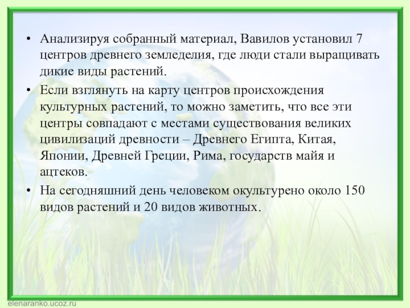 Слайд 13Анализируя собранный материал, Вавилов установил 7 центров древнего земледелия, где люди