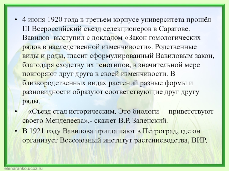 «Съезд стал историческим. Это биологи приветствуют своего Менделеева»,- скажет В.Р. Заленский.