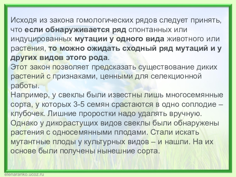 дикорастущих предков, позволил Н.И. Вавилову сформулировать закон, устанавливающий параллелизм в наследственной изменчивости организмов и имеющий большое значение как для теоретической генетики, так и для практической селекции.