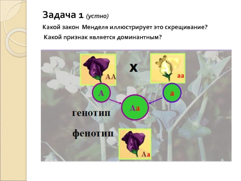 Задача 1 (устно)Какой закон Менделя иллюстрирует это скрещивание? Какой признак является доминантным?