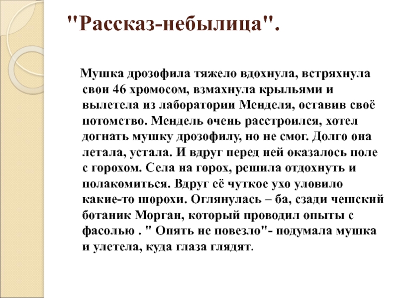 крыльями и вылетела из лаборатории Менделя, оставив своё потомство. Мендель очень расстроился, хотел догнать мушку дрозофилу, но не смог. Долго она летала, устала. И вдруг перед ней оказалось поле с горохом. Села на горох, решила отдохнуть и полакомиться. Вдруг её чуткое ухо уловило какие-то шорохи. Оглянулась – ба, сзади чешский ботаник Морган, который проводил опыты с фасолью . " Опять не повезло"- подумала мушка и улетела, куда глаза глядят.