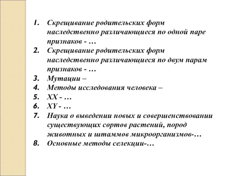 Слайд 5Скрещивание родительских форм наследственно различающиеся по одной паре признаков - …