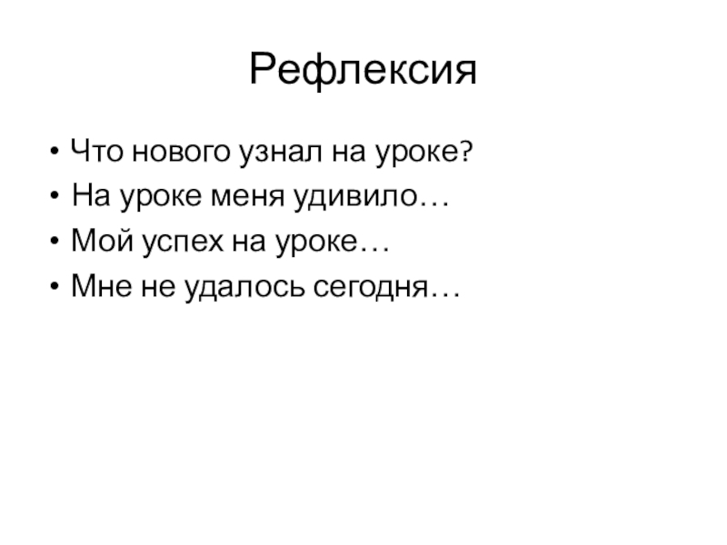 РефлексияЧто нового узнал на уроке?На уроке меня удивило…Мой успех на уроке…Мне не удалось сегодня…