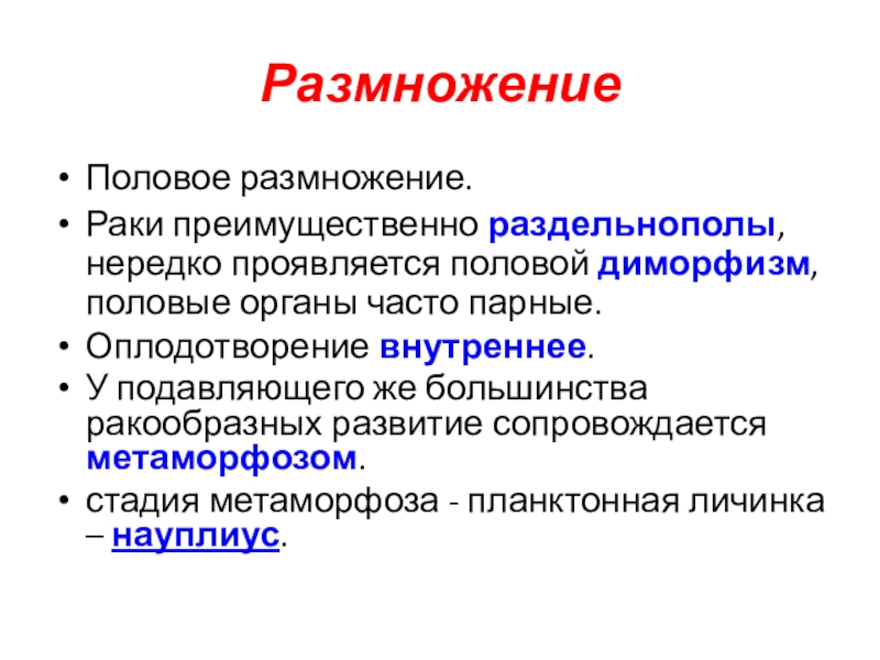 РазмножениеПоловое размножение.Раки преимущественно раздельнополы, нередко проявляется половой диморфизм, половые органы часто парные. Оплодотворение внутреннее. У подавляющего же