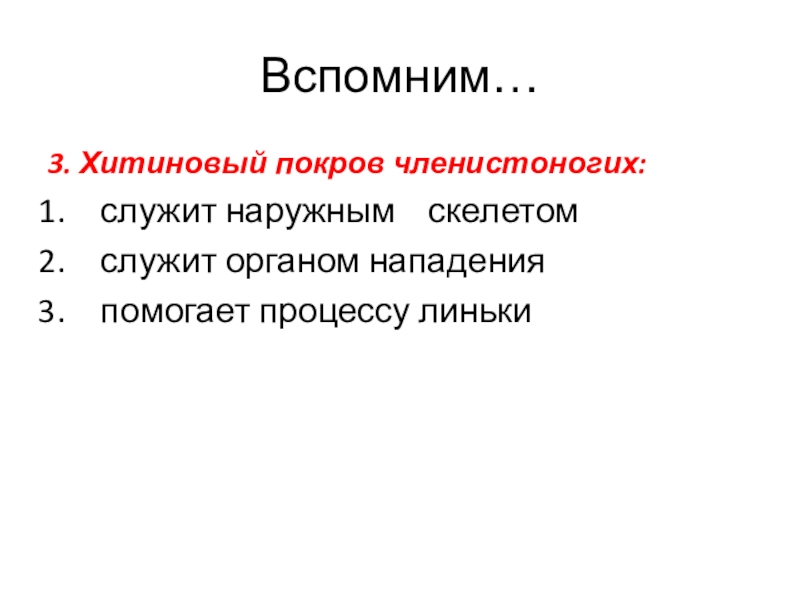 Вспомним…3. Хитиновый покров членистоногих: служит наружным  скелетом служит органом нападения помогает процессу линьки