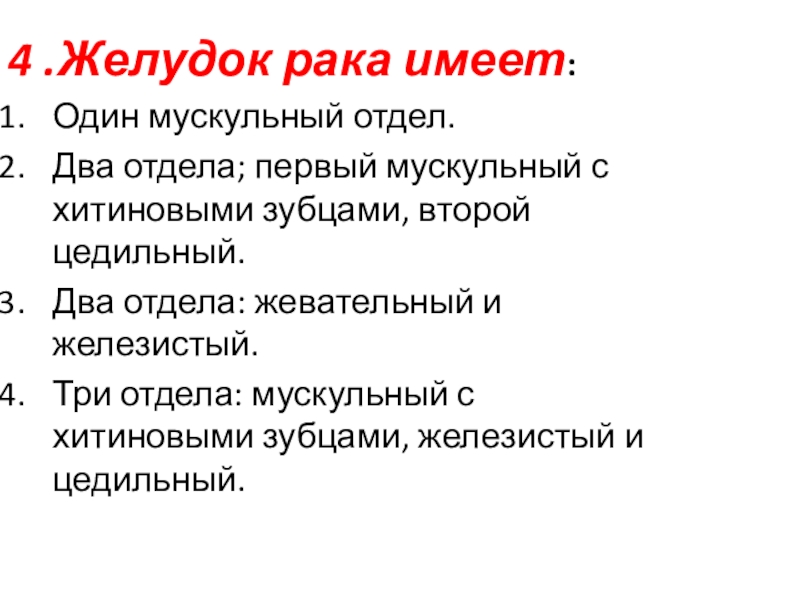 4 .Желудок рака имеет:Один мускульный отдел.Два отдела; первый мускульный с хитиновыми зубцами, второй цедильный.Два отдела: жевательный и