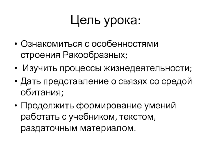 Цель урока:Ознакомиться с особенностями строения Ракообразных; Изучить процессы жизнедеятельности;Дать представление о связях со средой обитания; Продолжить формирование умений работать с учебником, текстом, раздаточным материалом.