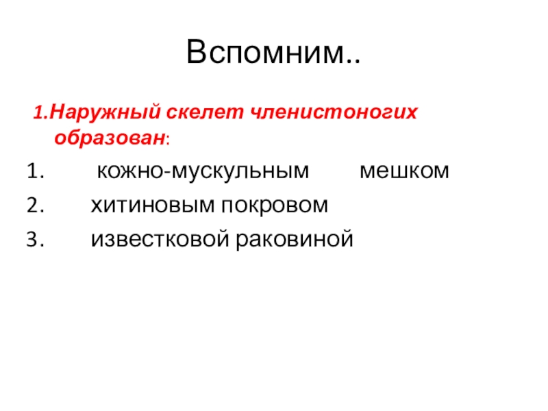 Вспомним..1.Наружный скелет членистоногих образован:   кожно-мускульным     мешком   хитиновым покровом