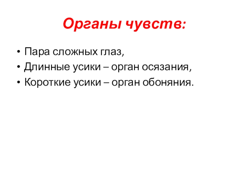 Органы чувств:Пара сложных глаз,Длинные усики – орган осязания,Короткие усики – орган обоняния.