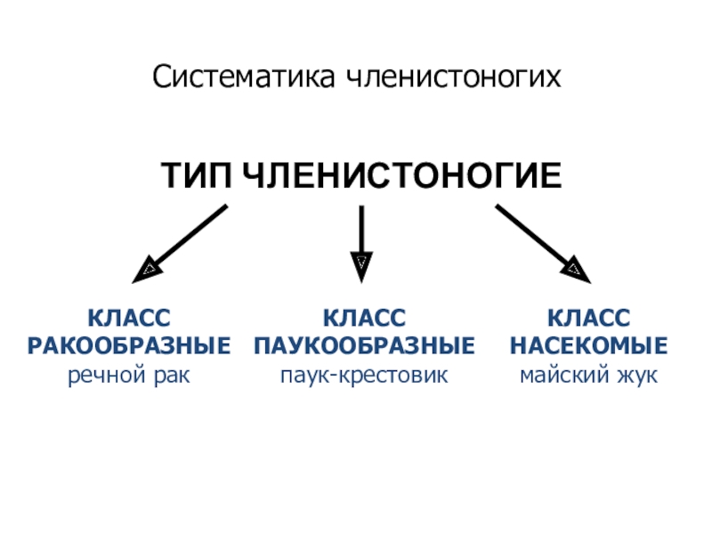 ТИП ЧЛЕНИСТОНОГИЕКЛАСС РАКООБРАЗНЫЕ речной ракСистематика членистоногихКЛАСС ПАУКООБРАЗНЫЕ паук-крестовикКЛАСС НАСЕКОМЫЕ майский жук
